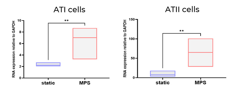 No, we have not undertaken single cell transcriptomics in the lung models – but it’s something we would like to do in the future to get a full picture of the model and how it compares to the human lung. We have performed qPCR analysis to demonstrate the presence of cell markers of key cell types (AT I / II markers in the alveolar model. Goblet, Club cell and ciliated epithelium markers in the bronchial model). This analysis showed an upregulation of these cell markers in the tissues cultured by the PhysioMimix OOC System. Large differences in gene expression have also been quantified using microscopy. When we add further complexity to the model (e.g., via the incorporation of endothelial cells), we observe further upregulation of these cell markers, which is indicative of enhanced cell-cell communication and a more physiologically relevant phenotype.