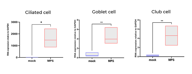 Bronchial model goblet cells produce mucus and alveolar model AT2 cells produce surfactant