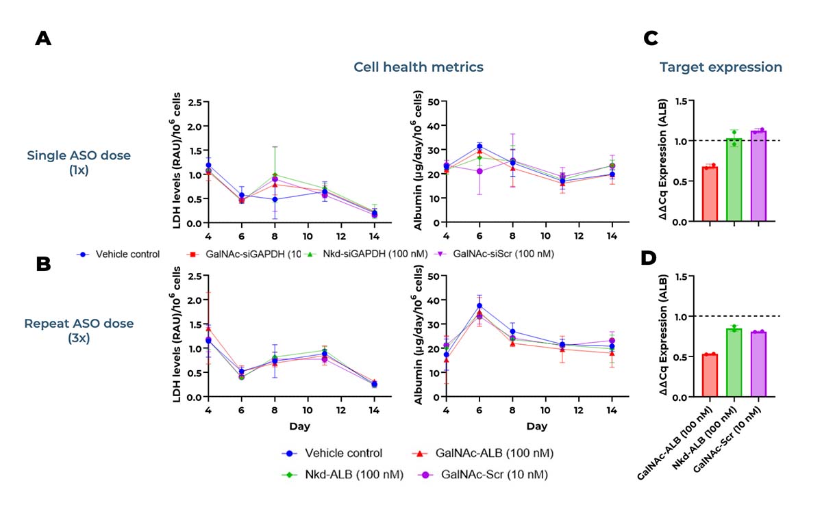 The longevity of the PhysioMimix oligonucleotide assay enables the simultaneous evaluation of oligonucleotide uptake, gene knockdown and tissue health.