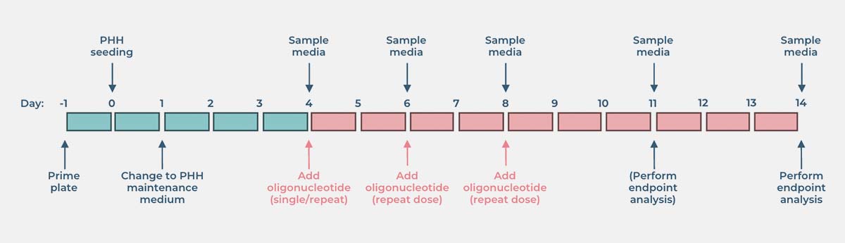 The PhysioMimix platform is a tissue culture device that recreates and sustains human liver microtissue from primary cells. Liver health measurements are achieved at various time points by sampling from the culture media. We advise that media samples be collected at every media change, i.e., every 2-3 days starting on day four before oligonucleotide dosing.